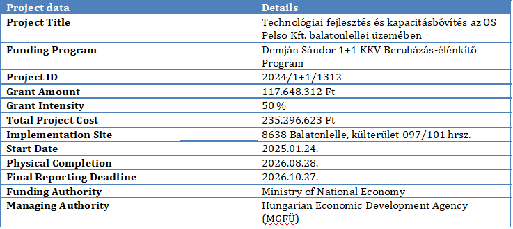 OS Pelso Kft. has received a non-refundable grant of HUF 117,648,312 with 50% intensity under the Demján Sándor 1+1 SME Investment Stimulus Program, based on the decision of the Ministry of National Economy. The development is implemented with the contribution of the Hungarian Economic Development Agency (MGFÜ) at the site located in the outskirts of Balatonlelle, Somogy County, parcel no. 097/10