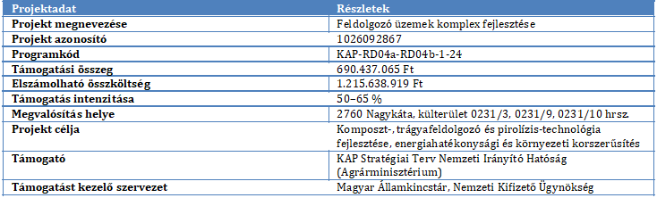 A támogatás több mint fele megújuló energiahasznosítási beruházásként valósul meg a pirolízis-technológia beépítésével, amely növényi szenet és hőenergiát állít elő. A fejlesztés a gyártási folyamat energiaigényének legalább 30 %-át megújuló forrásból fedezi. A projekt a körforgásos gazdaság alapelveit követi: a mezőgazdasági eredetű melléktermékek (trágya, növényi maradványok, iszap) feldolgozása újrahasznosítható, értékes talajjavító anyaggá válik, miközben a karbonkibocsátás csökken.